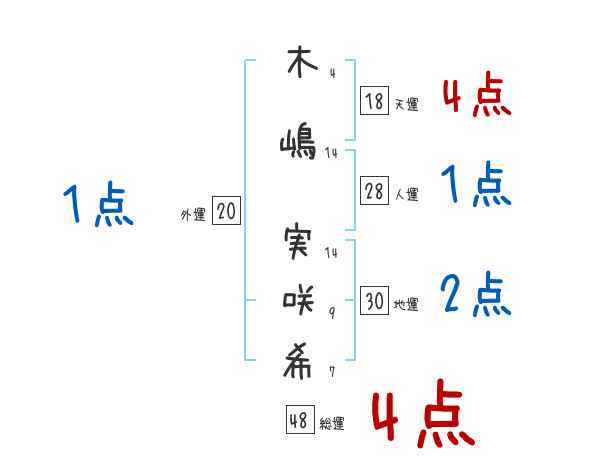 天運![]() | 木嶋実咲希さんの天運は18画の4つ星!情熱的で剛気。忍耐力があり信頼される。 家系が持つ宿命的な運勢を表します。祖先から受け継いだ苗字ですので自分の力が及びません。家柄を象徴します。 |
