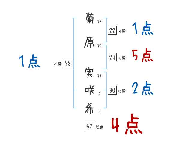 天運![]() | 菊原実咲希さんの天運は22画の1つ星!努力することが苦手ないっぽう手先が器用。芸術性にも優れる。 家系が持つ宿命的な運勢を表します。祖先から受け継いだ苗字ですので自分の力が及びません。家柄を象徴します。 |