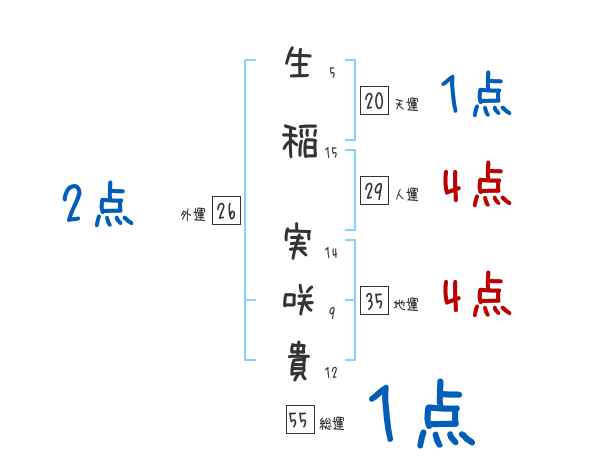 外運![]() | 生稲実咲貴さんの外運は26画の2つ星!波瀾万丈かも。信頼できる人を大事にしましょう。 生活面を象徴する運勢です。外部から受ける影響力を表し、結婚運、家庭運や職場、環境への順応性を表します。 |