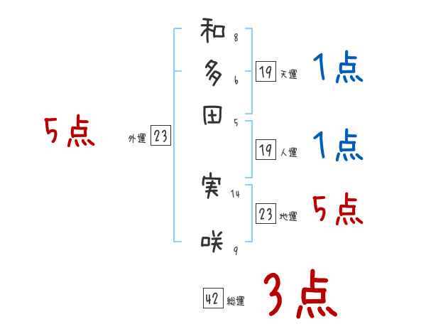 天運![]() | 和多田実咲さんの天運は19画の1つ星!優れた才能を持ちますが、協調性が足りないことも。周りの人と協力する事を意識しましょう。 家系が持つ宿命的な運勢を表します。祖先から受け継いだ苗字ですので自分の力が及びません。家柄を象徴します。 |
