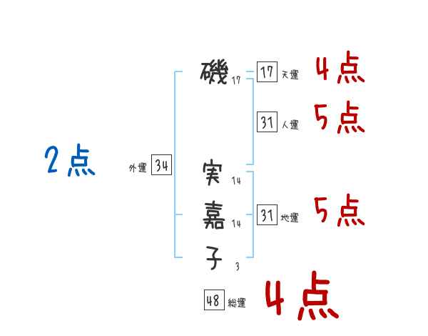 外運![]() | 磯実嘉子さんの外運は34画の2つ星!独創性に優れるが、自尊心が強く災難に注意しましょう。 生活面を象徴する運勢です。外部から受ける影響力を表し、結婚運、家庭運や職場、環境への順応性を表します。 |