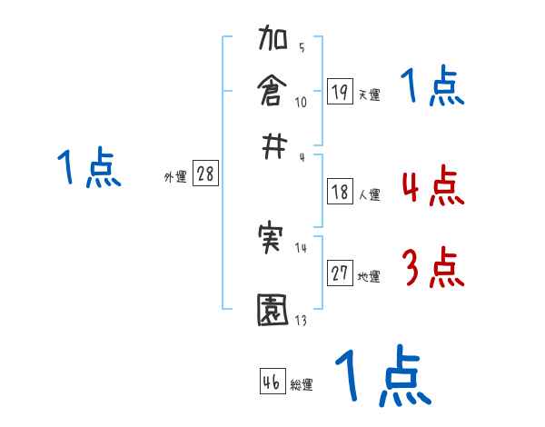 総運![]() | 加倉井実園さんの総運は46画の1つ星!迷走することが多く苦労するかも。目先のことにとらわれないように。 あなたの人生を表す1番重要な運勢です。生涯を通じて影響する総合運となり、主に50歳以降の晩年期に影響を及ぼします。 |