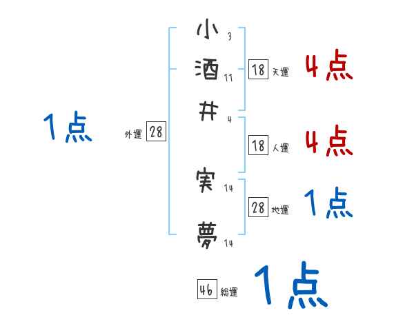 天運![]() | 小酒井実夢さんの天運は18画の4つ星!情熱的で剛気。忍耐力があり信頼される。 家系が持つ宿命的な運勢を表します。祖先から受け継いだ苗字ですので自分の力が及びません。家柄を象徴します。 |