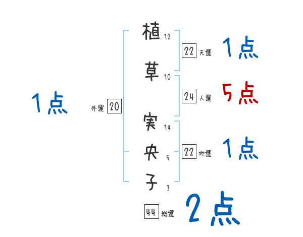 天運![]() | 植草実央子さんの天運は22画の1つ星!努力することが苦手ないっぽう手先が器用。芸術性にも優れる。 家系が持つ宿命的な運勢を表します。祖先から受け継いだ苗字ですので自分の力が及びません。家柄を象徴します。 |
