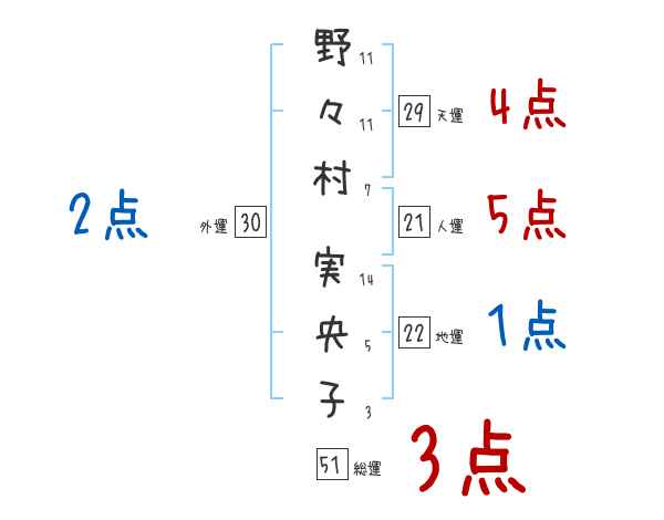 総運![]() | 野々村実央子さんの総運は51画の3つ星!変化が激しく、危険に注意。堅実な性格。 あなたの人生を表す1番重要な運勢です。生涯を通じて影響する総合運となり、主に50歳以降の晩年期に影響を及ぼします。 |