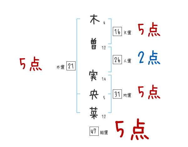 | 外運  | 木曽実央菜さんの外運は21画の5つ星!統率力がある。独立し成功する。名誉を手に入れる。生活面を象徴する運勢です。外部から受ける影響力を表し、結婚運、家庭運や職場、環境への順応性を表します。 |
