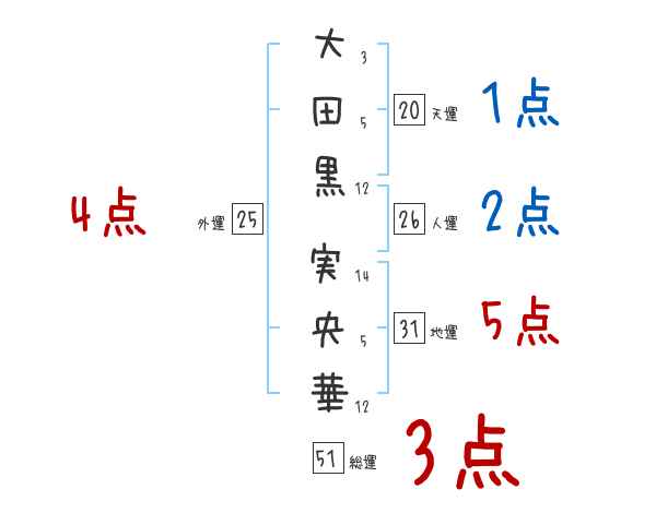 総運![]() | 大田黒実央華さんの総運は51画の3つ星!変化が激しく、危険に注意。堅実な性格。 あなたの人生を表す1番重要な運勢です。生涯を通じて影響する総合運となり、主に50歳以降の晩年期に影響を及ぼします。 |
