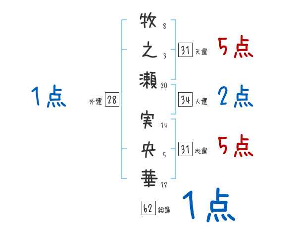 外運![]() | 牧之瀬実央華さんの外運は28画の1つ星!家庭環境に注意。スポーツで活躍できる能力があるかも。 生活面を象徴する運勢です。外部から受ける影響力を表し、結婚運、家庭運や職場、環境への順応性を表します。 |
