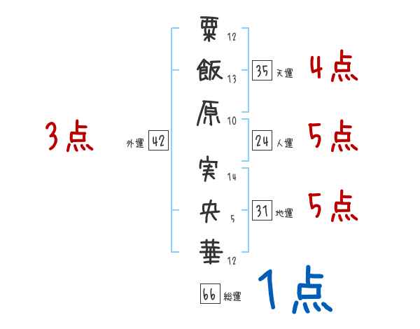 外運![]() | 粟飯原実央華さんの外運は42画の3つ星!病気に注意。多芸であるが消極的でおとなしい。 生活面を象徴する運勢です。外部から受ける影響力を表し、結婚運、家庭運や職場、環境への順応性を表します。 |