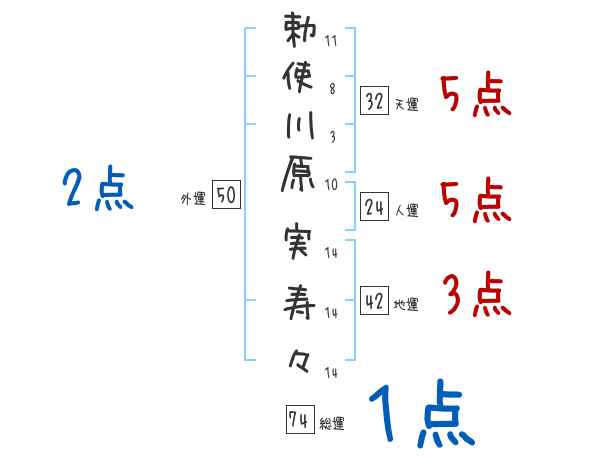 天運![]() | 勅使川原実寿々さんの天運は32画の5つ星!柔軟性があり成功する。チャンスが多く金運が良い。 家系が持つ宿命的な運勢を表します。祖先から受け継いだ苗字ですので自分の力が及びません。家柄を象徴します。 |