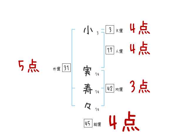 天運![]() | 小実寿々さんの天運は3画の4つ星!活動的で才能に恵まれ、多くの信頼を得る。希望に満ち成長する。 家系が持つ宿命的な運勢を表します。祖先から受け継いだ苗字ですので自分の力が及びません。家柄を象徴します。 |
