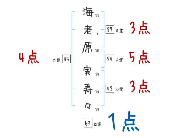天運![]() | 海老原実寿々さんの天運は27画の3つ星!頭脳明晰だが強情で摩擦が多い傾向。孤立に注意。 家系が持つ宿命的な運勢を表します。祖先から受け継いだ苗字ですので自分の力が及びません。家柄を象徴します。 |