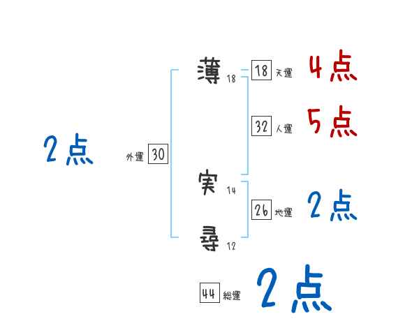 外運![]() | 薄実尋さんの外運は30画の2つ星!浮き沈みの激しさに注意しましょう。 生活面を象徴する運勢です。外部から受ける影響力を表し、結婚運、家庭運や職場、環境への順応性を表します。 |