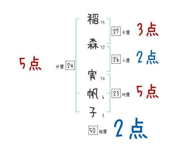 総運![]() | 稲森実帆子さんの総運は50画の2つ星!浮き沈みが激しく不安定。しりすぼみに衰退しやすいので注意しましょう。 あなたの人生を表す1番重要な運勢です。生涯を通じて影響する総合運となり、主に50歳以降の晩年期に影響を及ぼします。 |