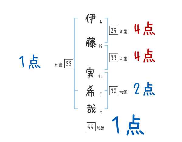 総運![]() | 伊藤実希哉さんの総運は55画の1つ星!欲張りな性格で軽率な行動に注意しましょう。病気に気をつけて。 あなたの人生を表す1番重要な運勢です。生涯を通じて影響する総合運となり、主に50歳以降の晩年期に影響を及ぼします。 |