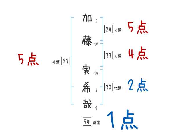 天運![]()  | 加藤実希哉さんの天運は24画の5つ星!家庭運が良く順調な人生。金運にも恵まれる。 家系が持つ宿命的な運勢を表します。祖先から受け継いだ苗字ですので自分の力が及びません。家柄を象徴します。 |