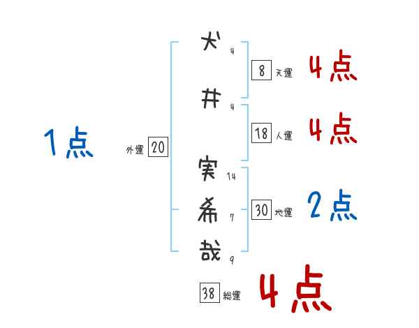 天運![]() | 犬井実希哉さんの天運は8画の4つ星!勤勉家。根気強く努力し成功する。忍耐力がある。 家系が持つ宿命的な運勢を表します。祖先から受け継いだ苗字ですので自分の力が及びません。家柄を象徴します。 |