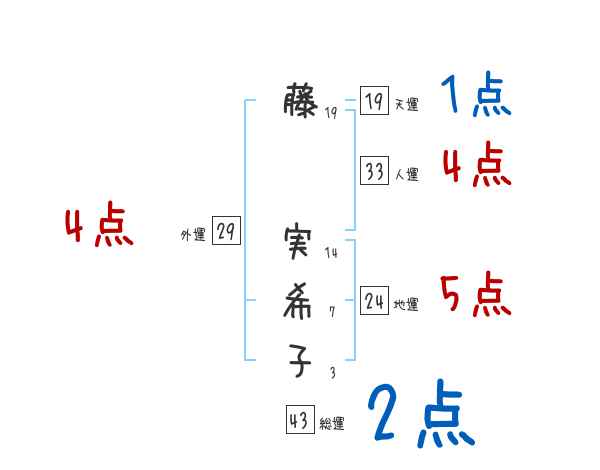 外運![]() | 藤実希子さんの外運は29画の4つ星!完全主義で才能がある。厳格な心の持ち主。 生活面を象徴する運勢です。外部から受ける影響力を表し、結婚運、家庭運や職場、環境への順応性を表します。 |