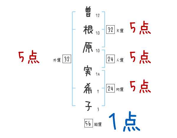 天運![]() | 曽根原実希子さんの天運は32画の5つ星!柔軟性があり成功する。チャンスが多く金運が良い。 家系が持つ宿命的な運勢を表します。祖先から受け継いだ苗字ですので自分の力が及びません。家柄を象徴します。 |
