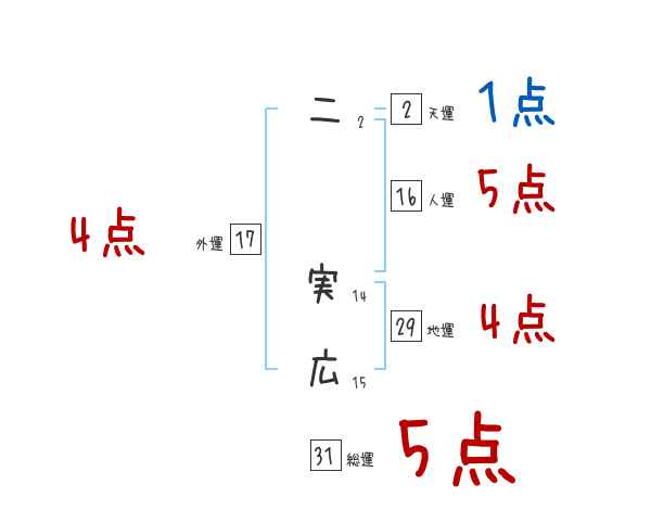 人運![]() | 二実広さんの人運は16画の5つ星!人望が厚く大きく発展する。逆転成功が見える。 性格や才能などを表す2番目に重要な運勢です。人間関係や協調性、社会的な成功に影響します。主に20歳から50歳ぐらいまでの中年期の運勢を表します。 |