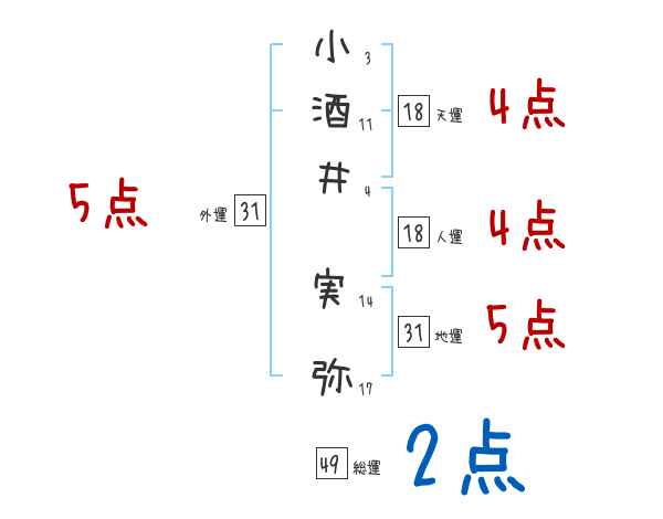 天運![]() | 小酒井実弥さんの天運は18画の4つ星!情熱的で剛気。忍耐力があり信頼される。 家系が持つ宿命的な運勢を表します。祖先から受け継いだ苗字ですので自分の力が及びません。家柄を象徴します。 |