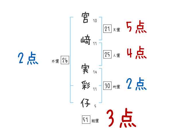 天運![]() | 宮﨑実彩仔さんの天運は21画の5つ星!統率力がある。独立し成功する。名誉を手に入れる。 家系が持つ宿命的な運勢を表します。祖先から受け継いだ苗字ですので自分の力が及びません。家柄を象徴します。 |