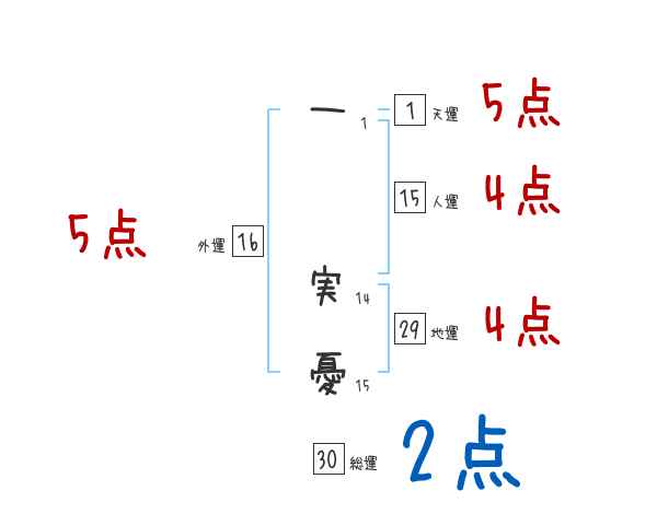 天運![]() | 一実憂さんの天運は1画の5つ星!行動力、指導力があり出世し繁栄する。幸運に恵まれる。 家系が持つ宿命的な運勢を表します。祖先から受け継いだ苗字ですので自分の力が及びません。家柄を象徴します。 |