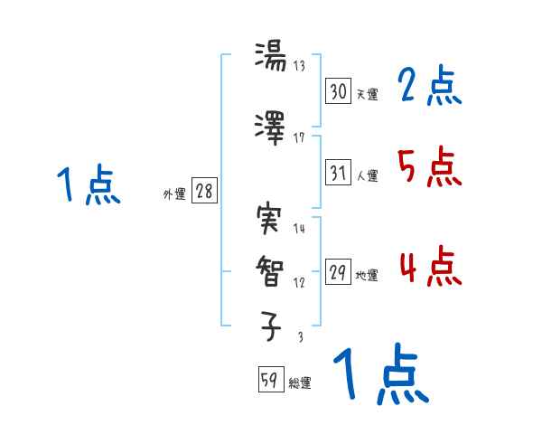 外運![]() | 湯澤実智子さんの外運は28画の1つ星!家庭環境に注意。スポーツで活躍できる能力があるかも。 生活面を象徴する運勢です。外部から受ける影響力を表し、結婚運、家庭運や職場、環境への順応性を表します。 |