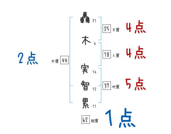外運![]() | 轟木実智累さんの外運は44画の2つ星!誠実で慎重な性格。物事を考えすぎないように注意しましょう。 生活面を象徴する運勢です。外部から受ける影響力を表し、結婚運、家庭運や職場、環境への順応性を表します。 |