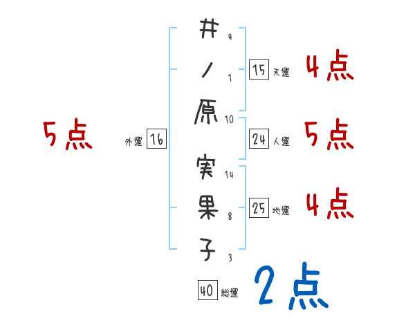 外運![]() | 井ノ原実果子さんの外運は16画の5つ星!人望が厚く大きく発展する。逆転成功が見える。 生活面を象徴する運勢です。外部から受ける影響力を表し、結婚運、家庭運や職場、環境への順応性を表します。 |