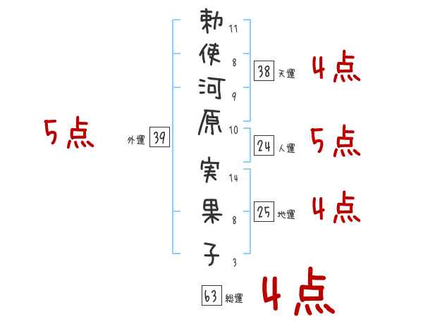 総運![]() | 勅使河原実果子さんの総運は63画の4つ星!家庭運がよく順調な生活。温和な性格。 あなたの人生を表す1番重要な運勢です。生涯を通じて影響する総合運となり、主に50歳以降の晩年期に影響を及ぼします。 |