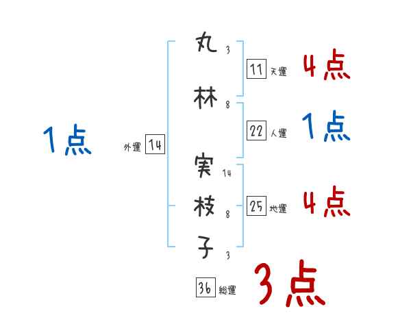 天運![]() | 丸林実枝子さんの天運は11画の4つ星!着実に富や地位を得る幸運な人生。 家系が持つ宿命的な運勢を表します。祖先から受け継いだ苗字ですので自分の力が及びません。家柄を象徴します。 |