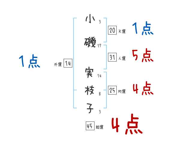 外運![]() | 小磯実枝子さんの外運は14画の1つ星!人に対して優しいがストレスを溜め込みがち。人間関係のトラブルを避けるよう気をつけましょう。 生活面を象徴する運勢です。外部から受ける影響力を表し、結婚運、家庭運や職場、環境への順応性を表します。 |
