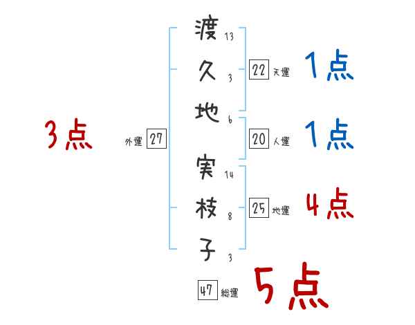 外運![]() | 渡久地実枝子さんの外運は27画の3つ星!頭脳明晰だが強情で摩擦が多い傾向。孤立に注意。 生活面を象徴する運勢です。外部から受ける影響力を表し、結婚運、家庭運や職場、環境への順応性を表します。 |