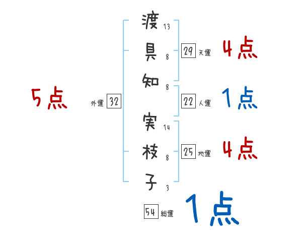 外運![]() | 渡具知実枝子さんの外運は32画の5つ星!柔軟性があり成功する。チャンスが多く金運が良い。 生活面を象徴する運勢です。外部から受ける影響力を表し、結婚運、家庭運や職場、環境への順応性を表します。 |