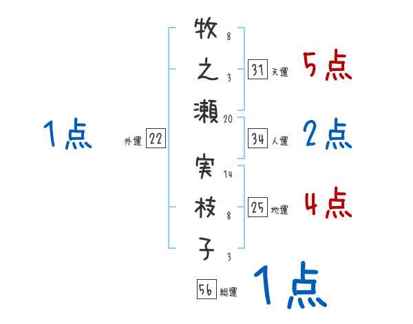 総運![]() | 牧之瀬実枝子さんの総運は56画の1つ星!消極的で無気力になりがち。誠実な気持ちが必要でしょう。 あなたの人生を表す1番重要な運勢です。生涯を通じて影響する総合運となり、主に50歳以降の晩年期に影響を及ぼします。 |