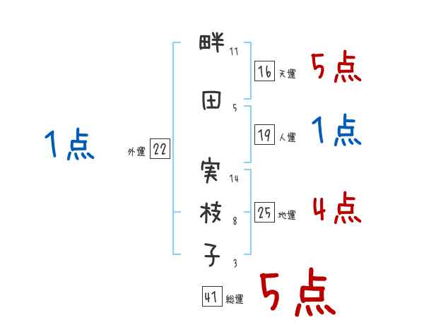 外運![]() | 畔田実枝子さんの外運は22画の1つ星!努力することが苦手ないっぽう手先が器用。芸術性にも優れる。 生活面を象徴する運勢です。外部から受ける影響力を表し、結婚運、家庭運や職場、環境への順応性を表します。 |