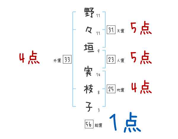 天運![]() | 野々垣実枝子さんの天運は31画の5つ星!社交性があり判断力に優れる。順風満帆な人生で円満な生活。 家系が持つ宿命的な運勢を表します。祖先から受け継いだ苗字ですので自分の力が及びません。家柄を象徴します。 |