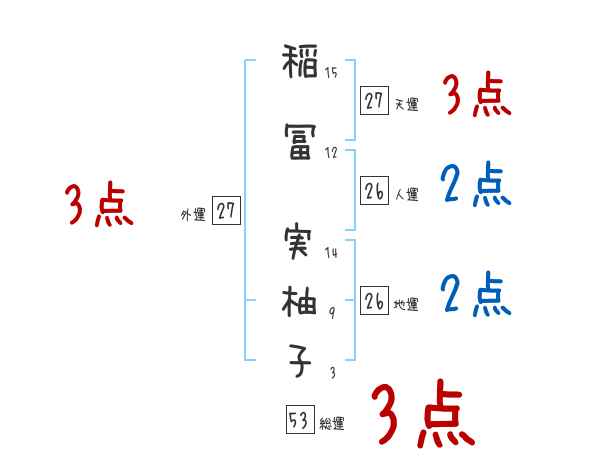 天運![]() | 稲冨実柚子さんの天運は27画の3つ星!頭脳明晰だが強情で摩擦が多い傾向。孤立に注意。 家系が持つ宿命的な運勢を表します。祖先から受け継いだ苗字ですので自分の力が及びません。家柄を象徴します。 |