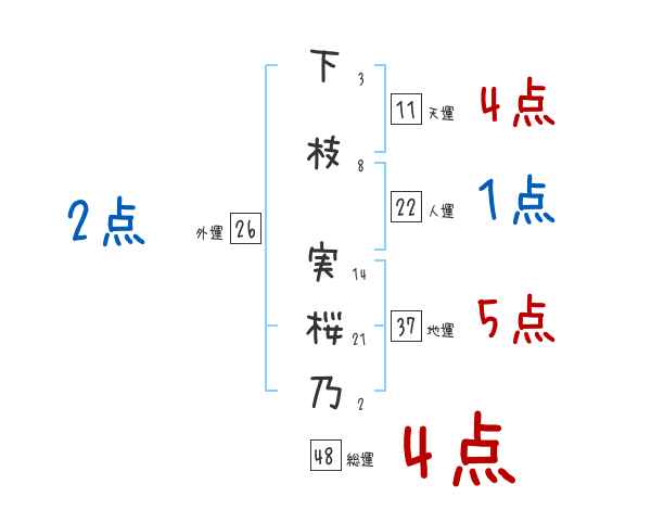 人運![]() | 下枝実桜乃さんの人運は22画の1つ星!努力することが苦手ないっぽう手先が器用。芸術性にも優れる。 性格や才能などを表す2番目に重要な運勢です。人間関係や協調性、社会的な成功に影響します。主に20歳から50歳ぐらいまでの中年期の運勢を表します。 |