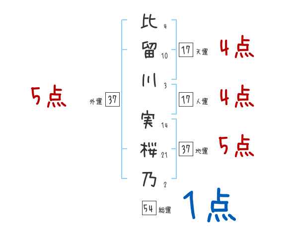 外運![]() | 比留川実桜乃さんの外運は37画の5つ星!努力家で順応性に優れる。現実的な考え方ができ忠実に物事をこなす。 生活面を象徴する運勢です。外部から受ける影響力を表し、結婚運、家庭運や職場、環境への順応性を表します。 |