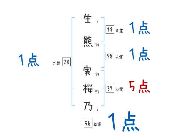 総運![]() | 生熊実桜乃さんの総運は56画の1つ星!消極的で無気力になりがち。誠実な気持ちが必要でしょう。 あなたの人生を表す1番重要な運勢です。生涯を通じて影響する総合運となり、主に50歳以降の晩年期に影響を及ぼします。 |
