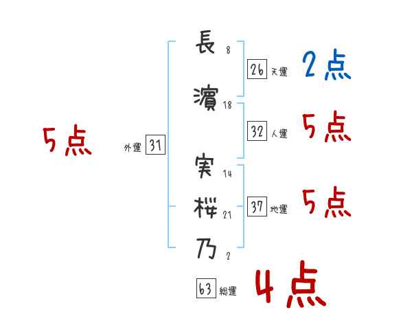 天運![]() | 長濵実桜乃さんの天運は26画の2つ星!波瀾万丈かも。信頼できる人を大事にしましょう。 家系が持つ宿命的な運勢を表します。祖先から受け継いだ苗字ですので自分の力が及びません。家柄を象徴します。 |