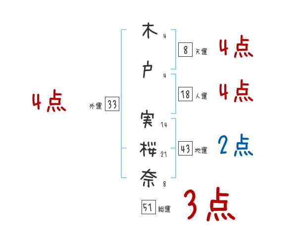 人運![]() | 木戸実桜奈さんの人運は18画の4つ星!情熱的で剛気。忍耐力があり信頼される。 性格や才能などを表す2番目に重要な運勢です。人間関係や協調性、社会的な成功に影響します。主に20歳から50歳ぐらいまでの中年期の運勢を表します。 |