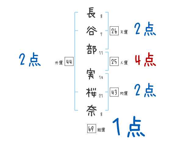 外運![]() | 長谷部実桜奈さんの外運は44画の2つ星!誠実で慎重な性格。物事を考えすぎないように注意しましょう。 生活面を象徴する運勢です。外部から受ける影響力を表し、結婚運、家庭運や職場、環境への順応性を表します。 |