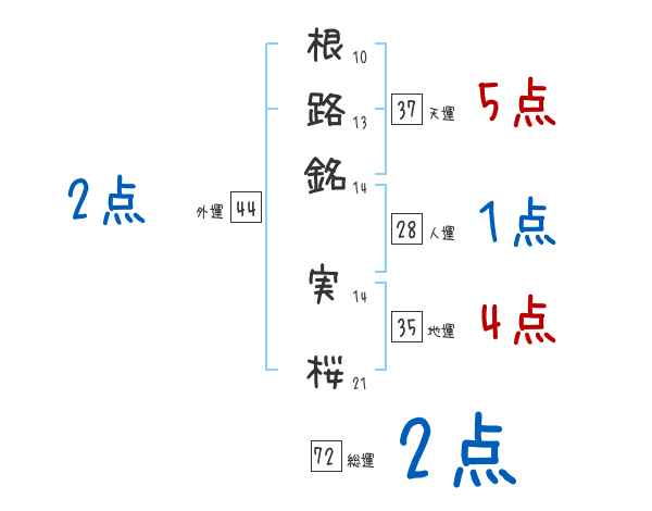 人運![]() | 根路銘実桜さんの人運は28画の1つ星!家庭環境に注意。スポーツで活躍できる能力があるかも。 性格や才能などを表す2番目に重要な運勢です。人間関係や協調性、社会的な成功に影響します。主に20歳から50歳ぐらいまでの中年期の運勢を表します。 |