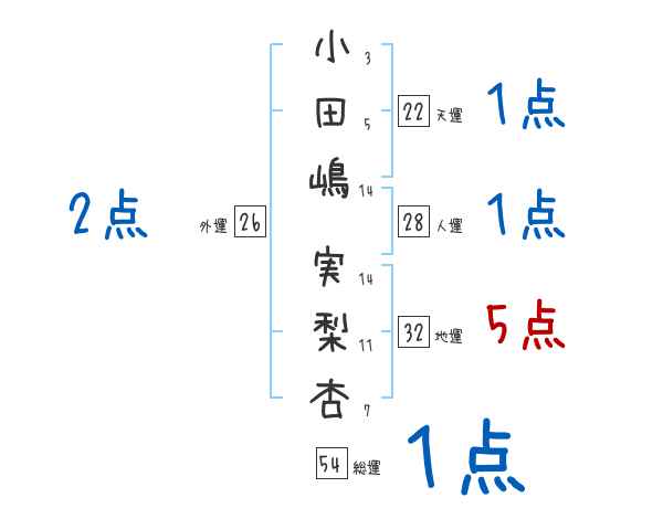 外運![]() | 小田嶋実梨杏さんの外運は26画の2つ星!波瀾万丈かも。信頼できる人を大事にしましょう。 生活面を象徴する運勢です。外部から受ける影響力を表し、結婚運、家庭運や職場、環境への順応性を表します。 |