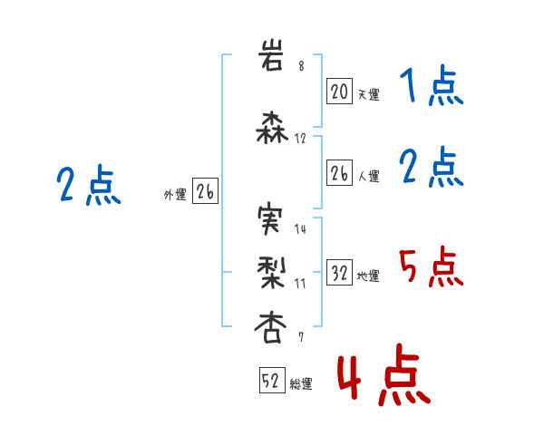 外運![]() | 岩森実梨杏さんの外運は26画の2つ星!波瀾万丈かも。信頼できる人を大事にしましょう。 生活面を象徴する運勢です。外部から受ける影響力を表し、結婚運、家庭運や職場、環境への順応性を表します。 |