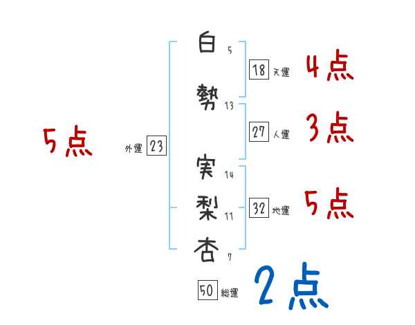 天運![]() | 白勢実梨杏さんの天運は18画の4つ星!情熱的で剛気。忍耐力があり信頼される。 家系が持つ宿命的な運勢を表します。祖先から受け継いだ苗字ですので自分の力が及びません。家柄を象徴します。 |