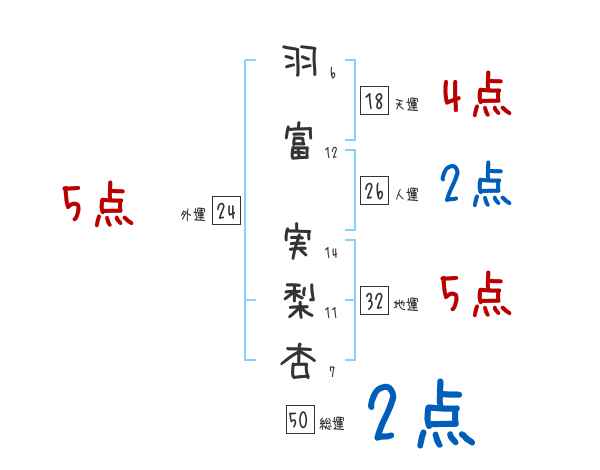 天運![]() | 羽富実梨杏さんの天運は18画の4つ星!情熱的で剛気。忍耐力があり信頼される。 家系が持つ宿命的な運勢を表します。祖先から受け継いだ苗字ですので自分の力が及びません。家柄を象徴します。 |